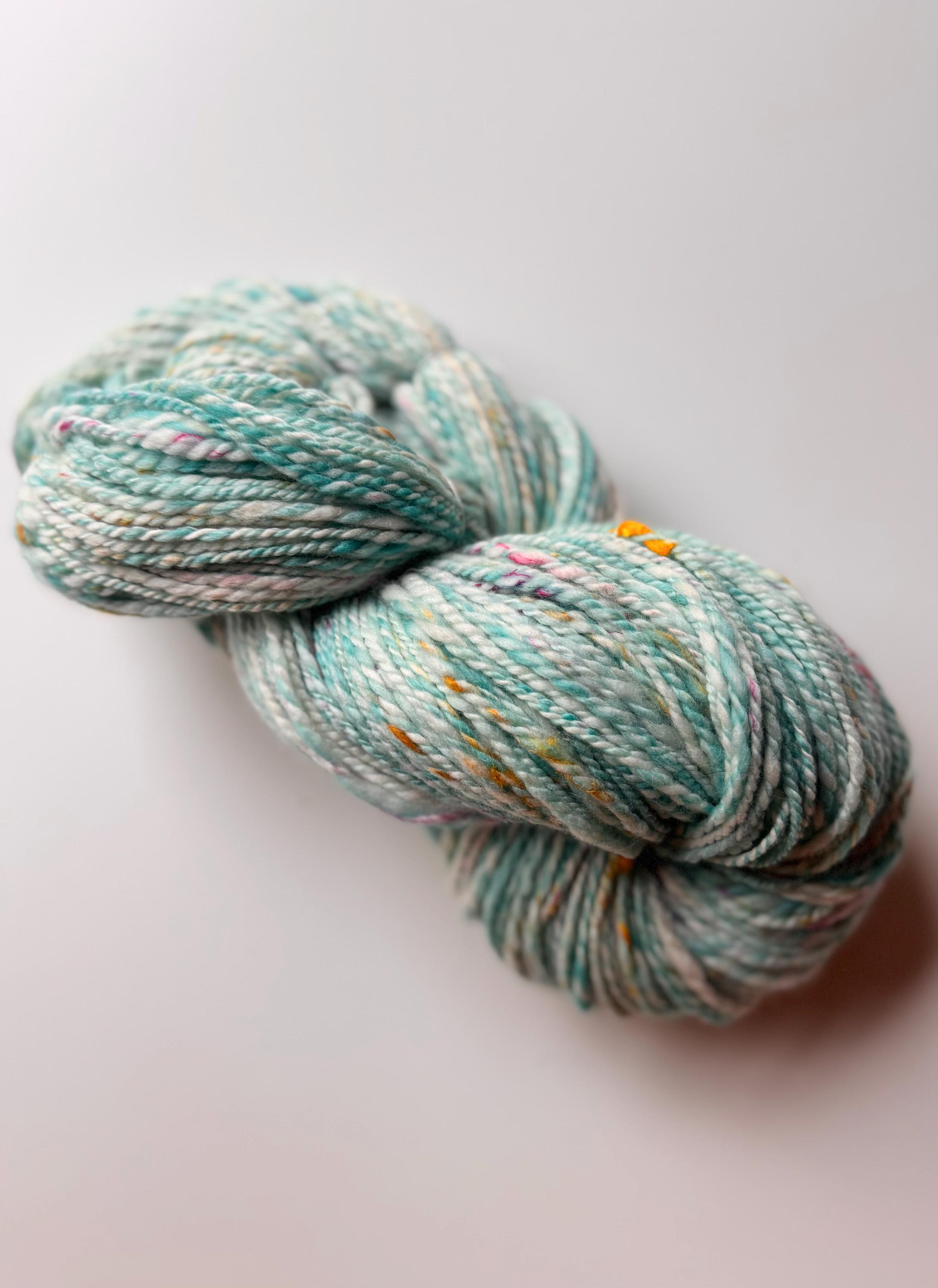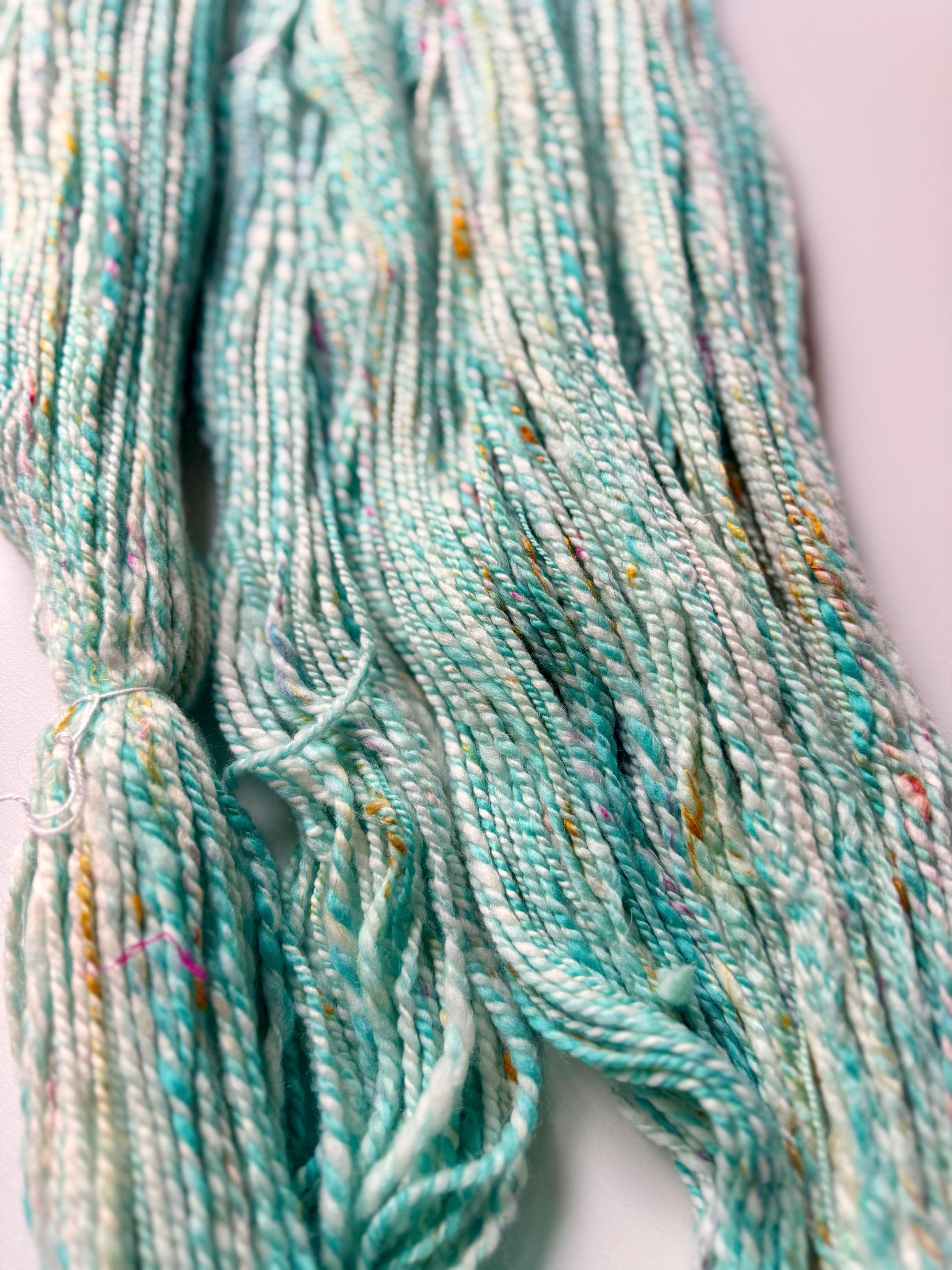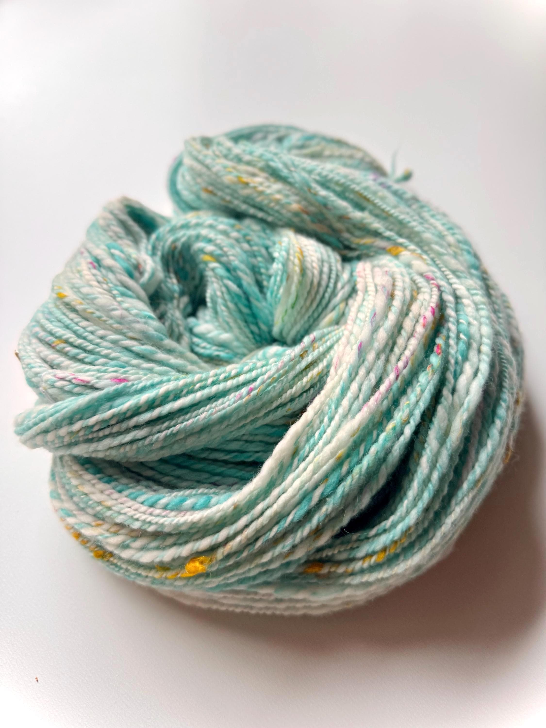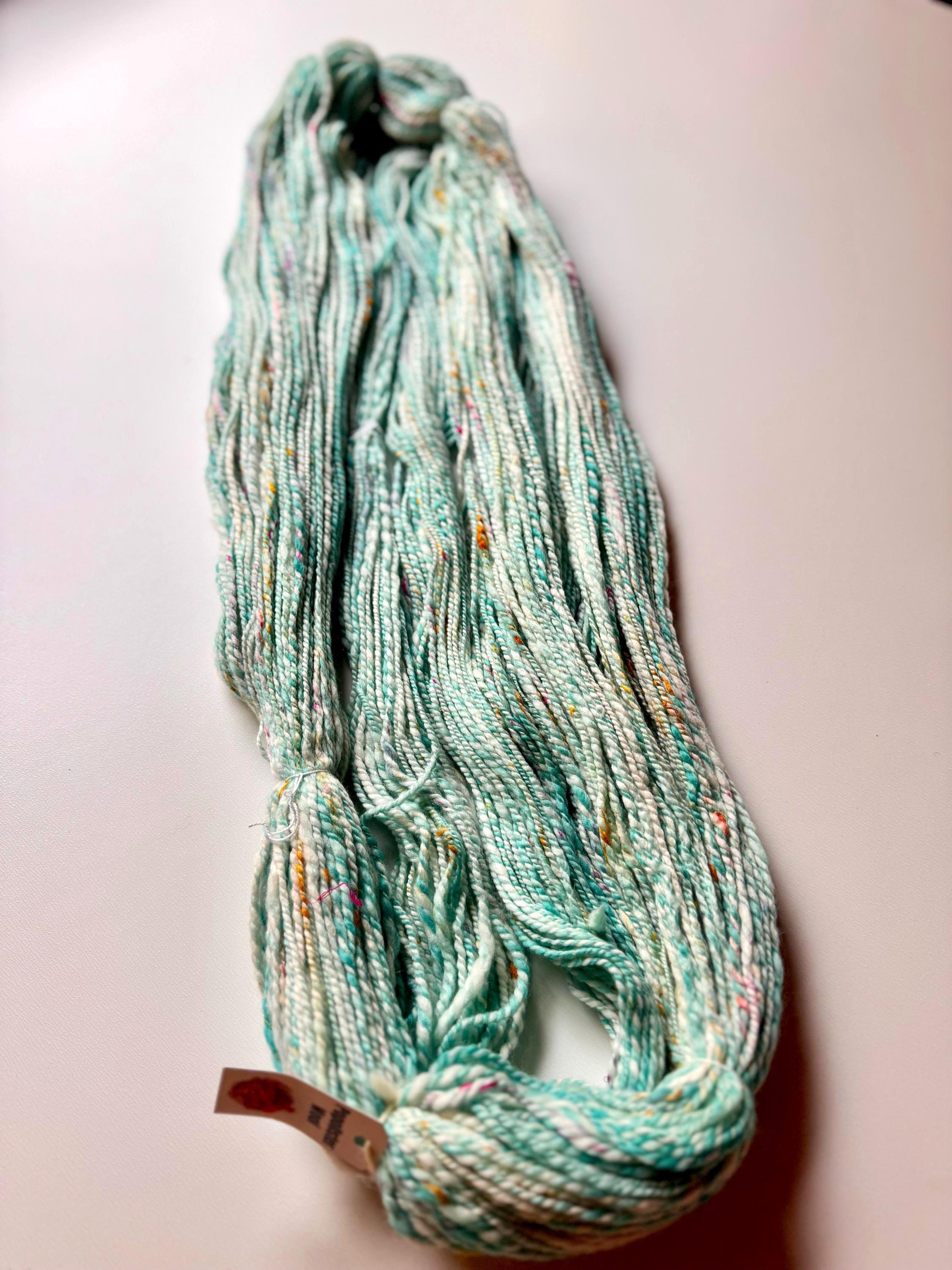 All the yarns I sell here on Etsy are hand-spun by me. The first picture is photographed under daylight in the room. The video was also shot in the room under daylight. Depending on the screen, the displayed color may differ slightly from the actual color.